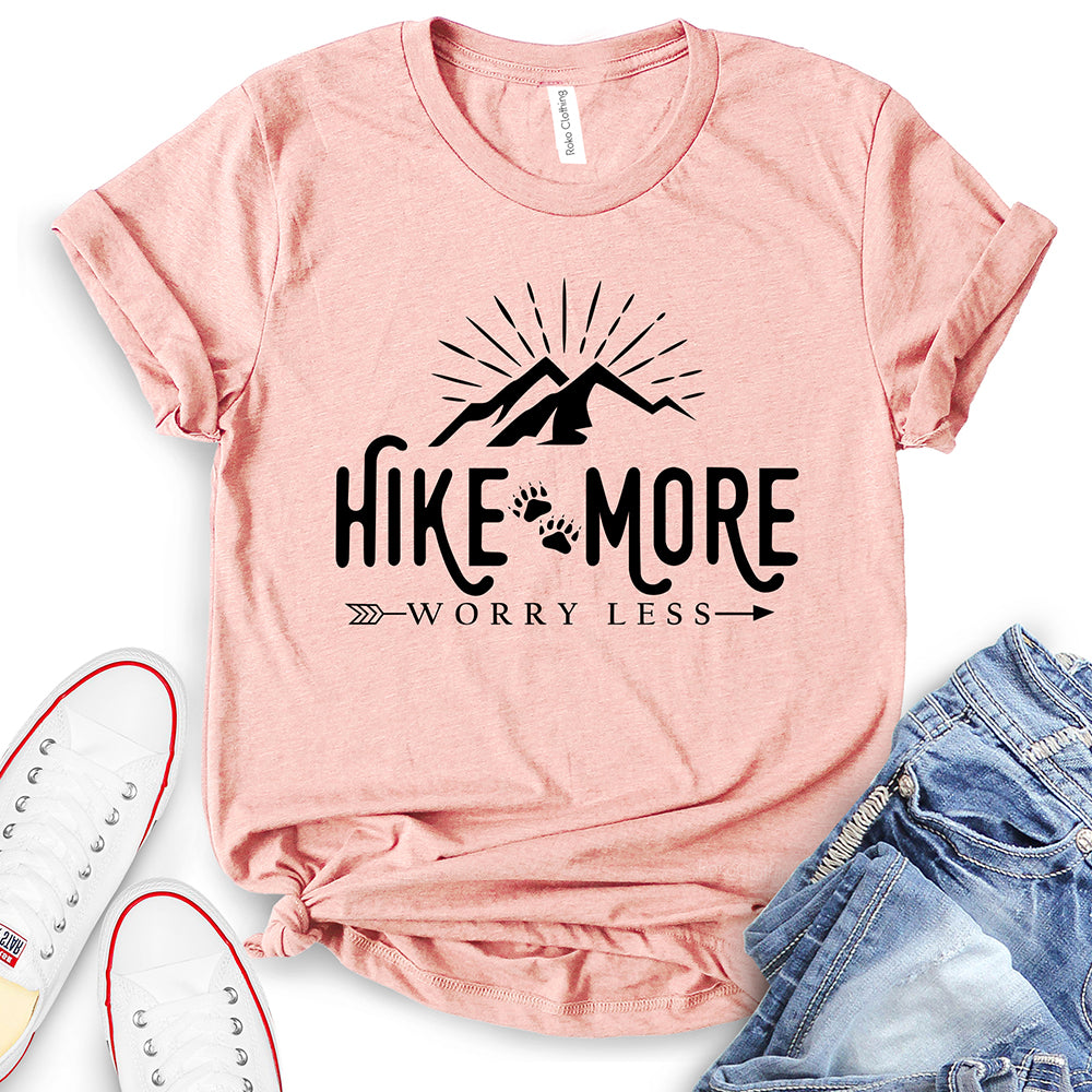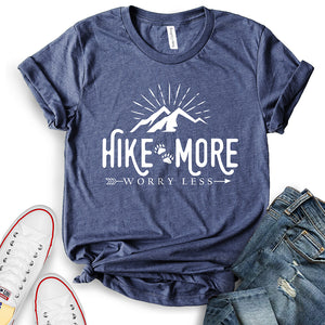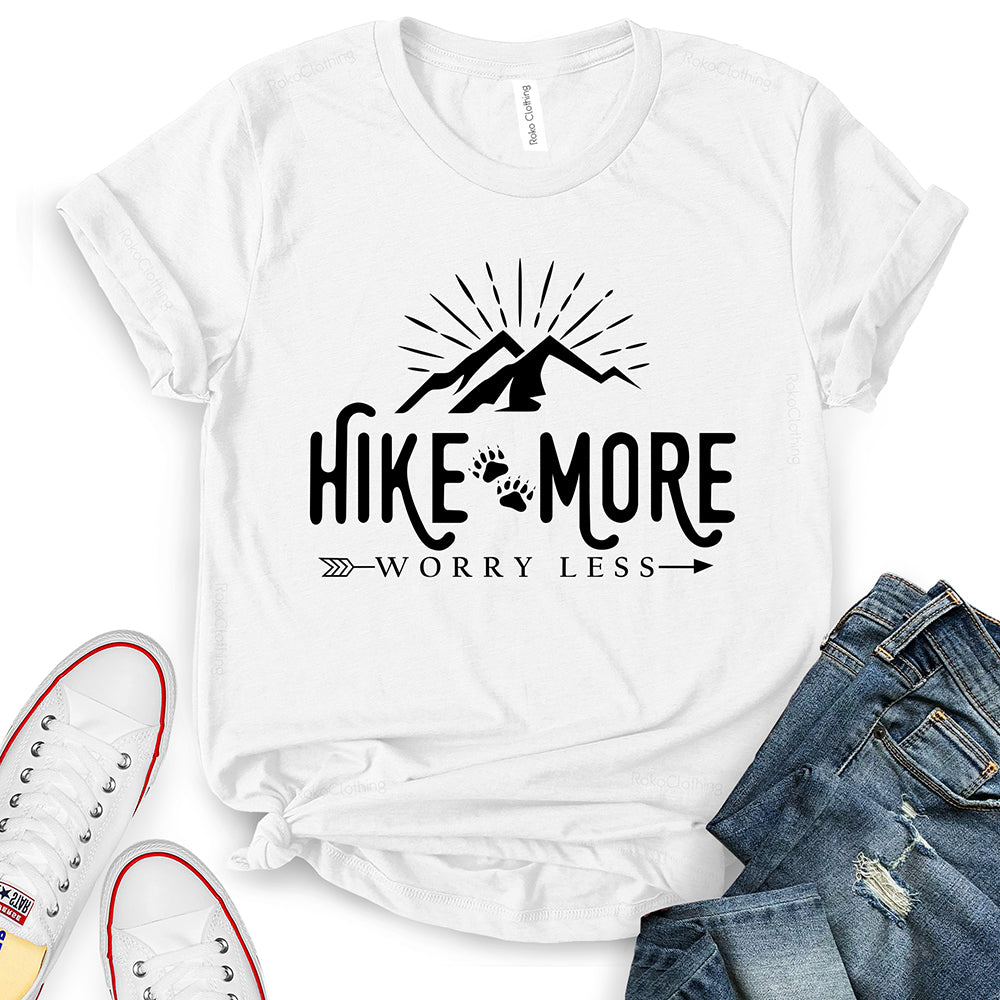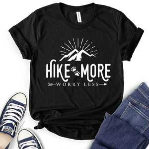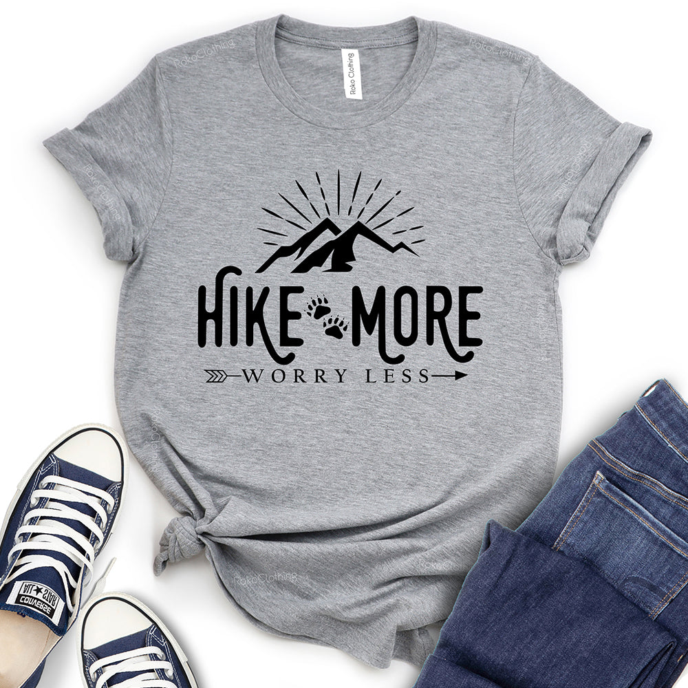 - HIKE MORE WORRY LESS : A "Hike More Worry Less" T-Shirt is a clothing item that features the phrase "Hike More Worry Less" as the main design or text on the shirt. It is inspired by the idea of embracing nature, adventure, and the outdoors while letting go of worries and stress. These T-shirts are popular among hiking enthusiasts, nature lovers, and those who seek a carefree and adventurous mindset. Wearing a "Hike More Worry Less" T-Shirt can serve as a reminder to prioritize outdoor activities, enjoy the beauty of nature, and adopt a more relaxed and positive outlook on life.
