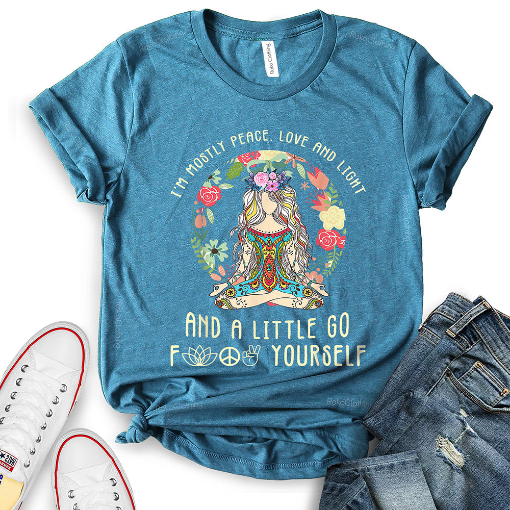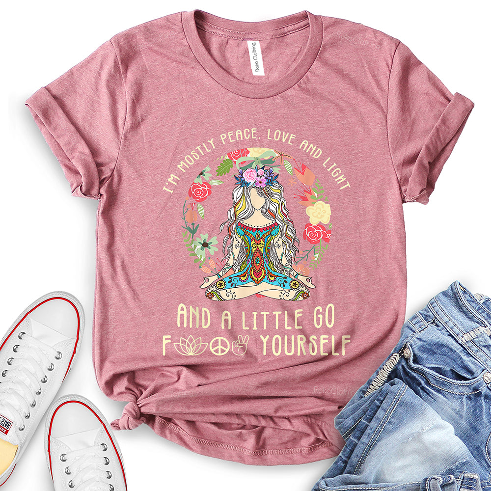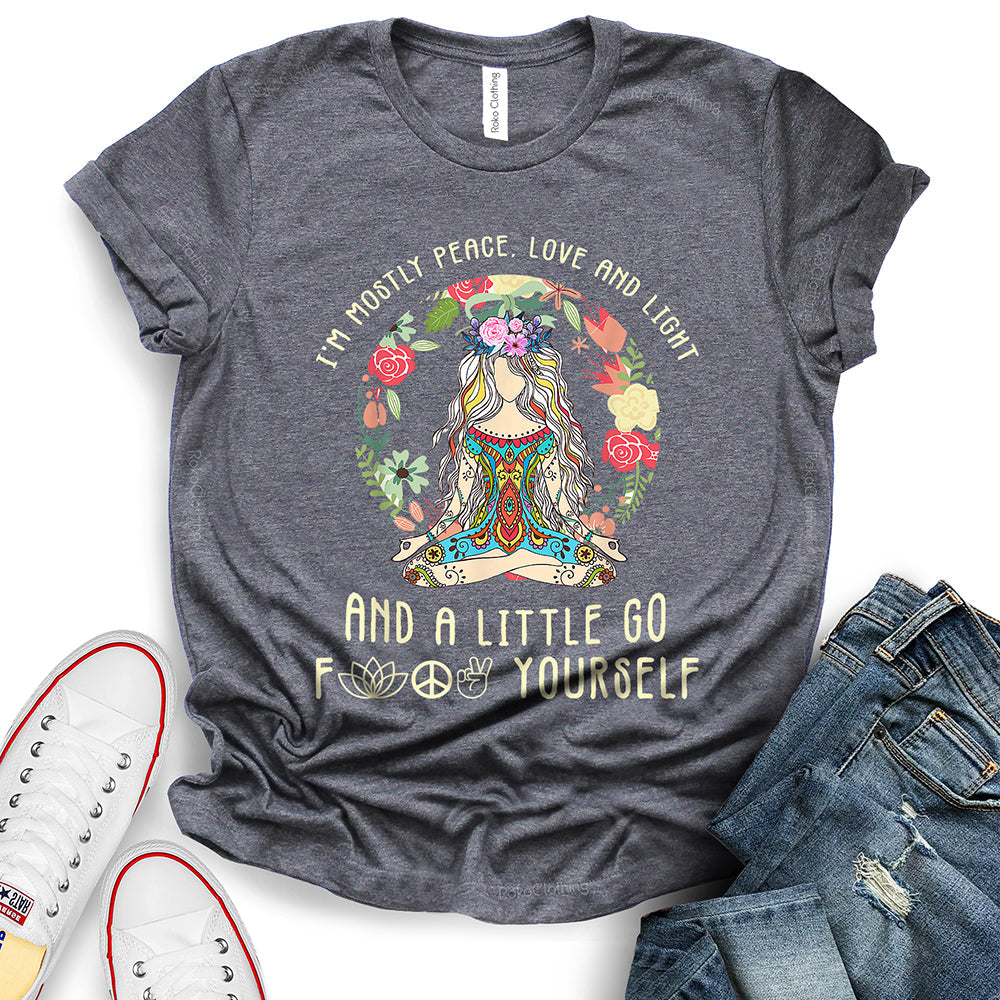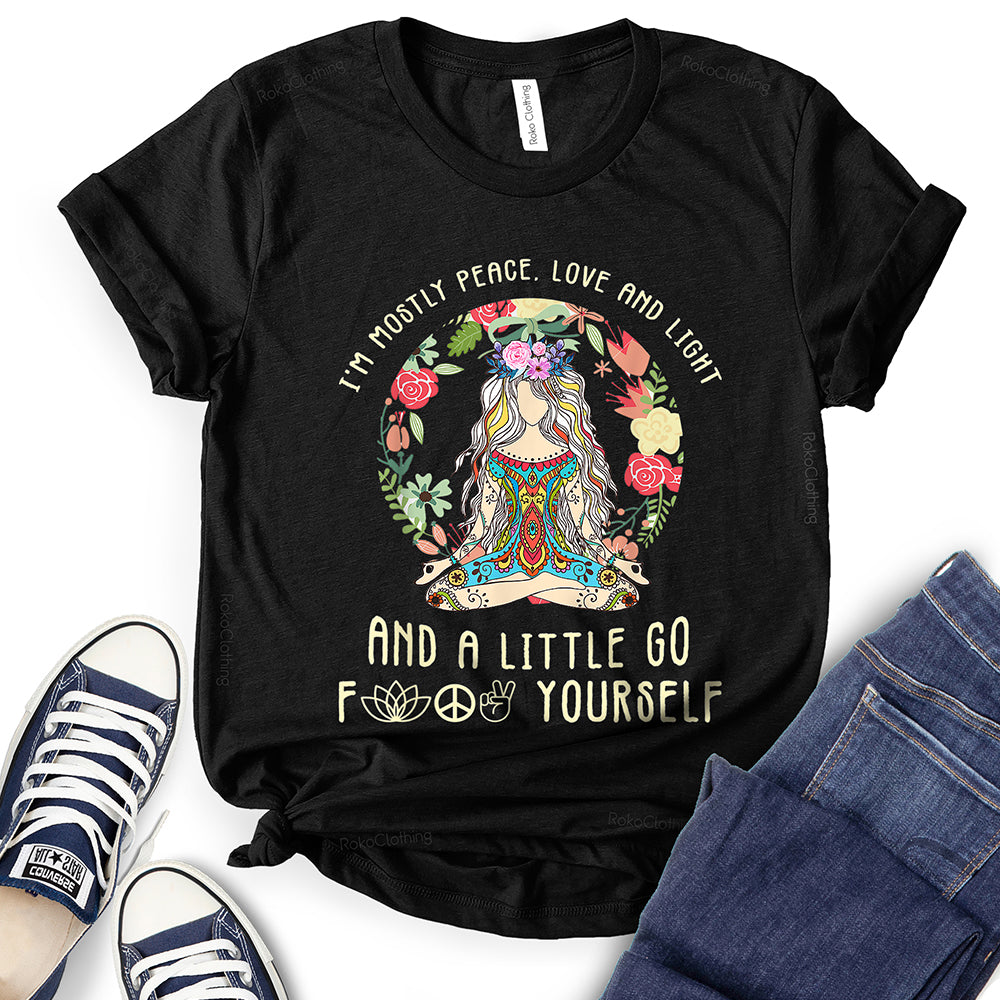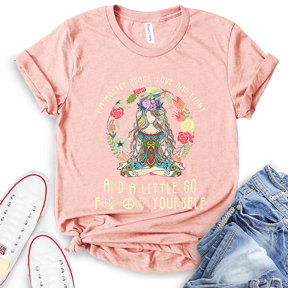 - WIDELY USAGE: I’m Mostly Peace Love and Light T-Shirt is suitable for casual, school, home, street, office, party, camping, hiking, shopping, daily life, etc. You can easily match with shorts, pants, jeans, shoes, boots, etc. Such a beautiful and temperamental T-shirt will make you more fashionable and attractive!