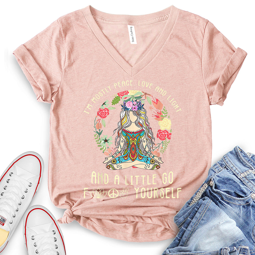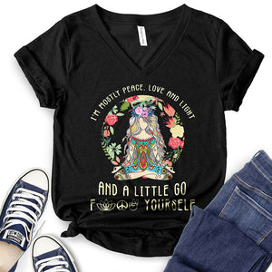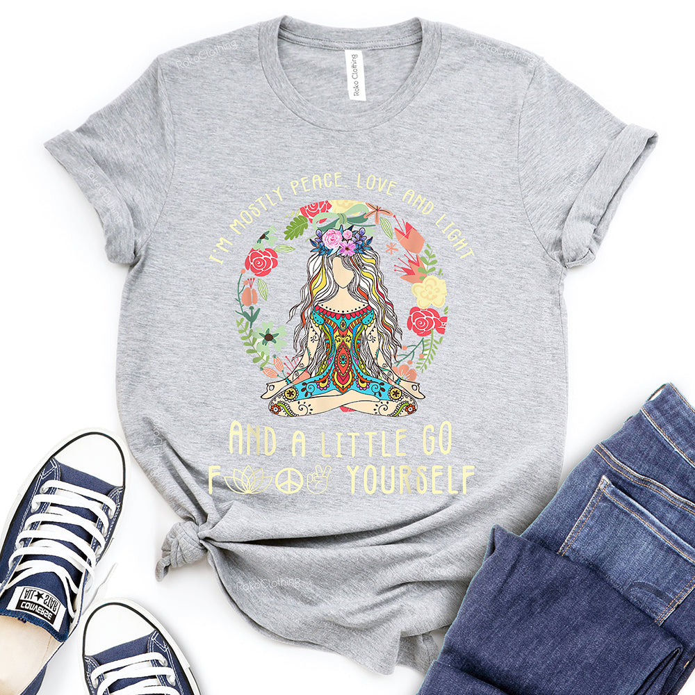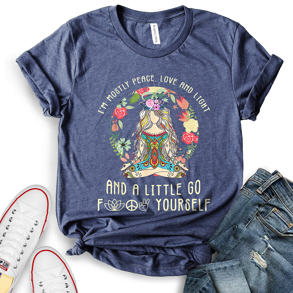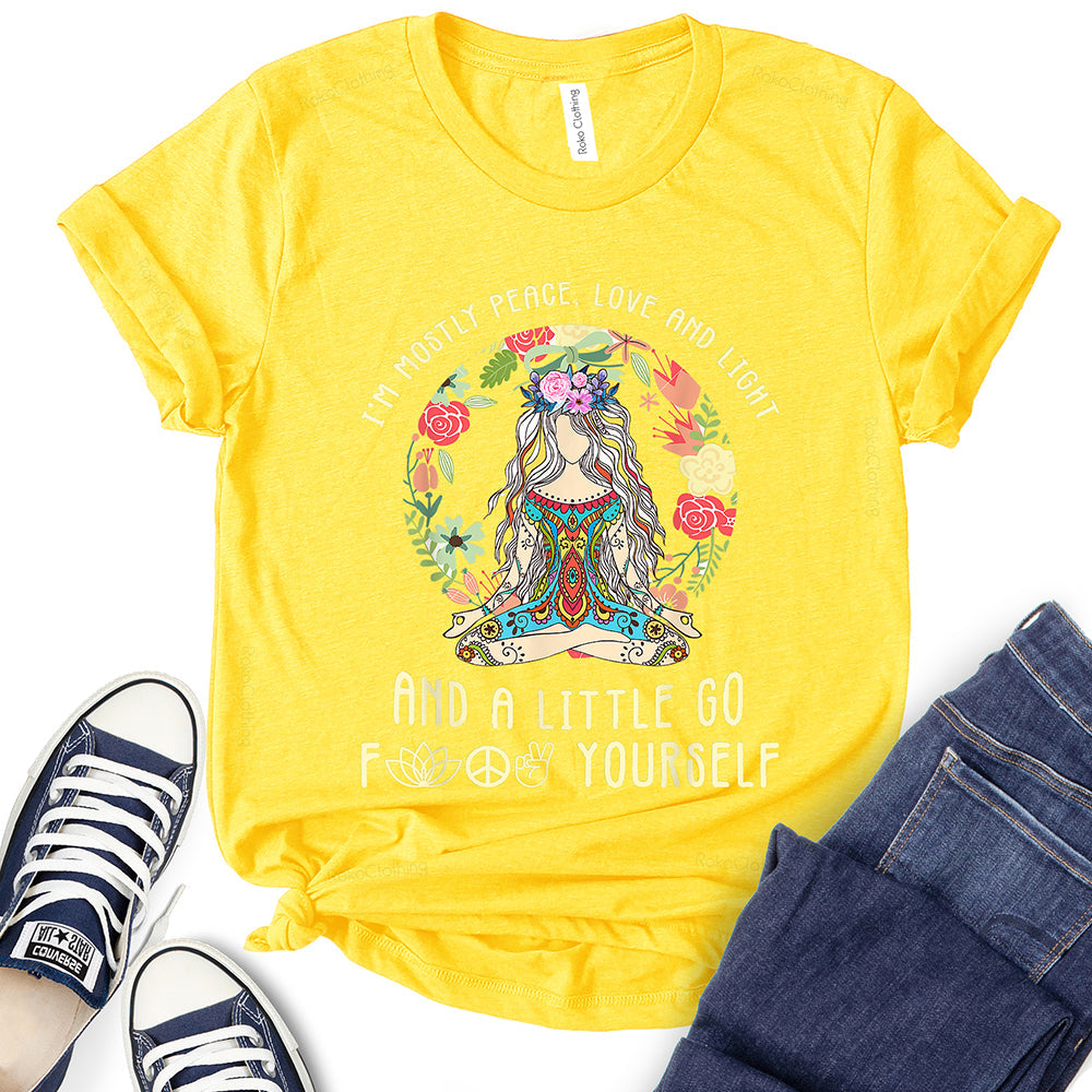 - WIDELY USAGE: I’m Mostly Peace Love and Light T-Shirt is suitable for casual, school, home, street, office, party, camping, hiking, shopping, daily life, etc. You can easily match with shorts, pants, jeans, shoes, boots, etc. Such a beautiful and temperamental T-shirt will make you more fashionable and attractive!