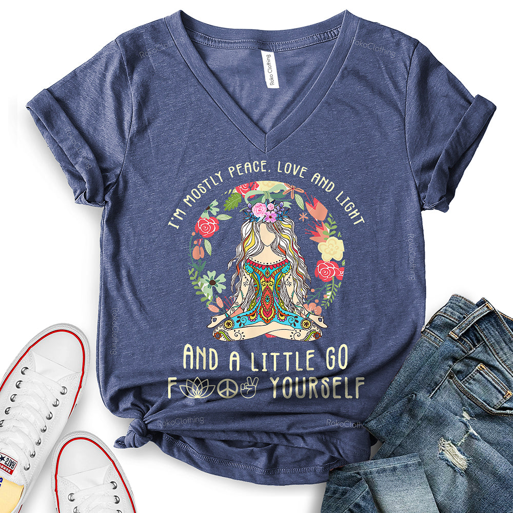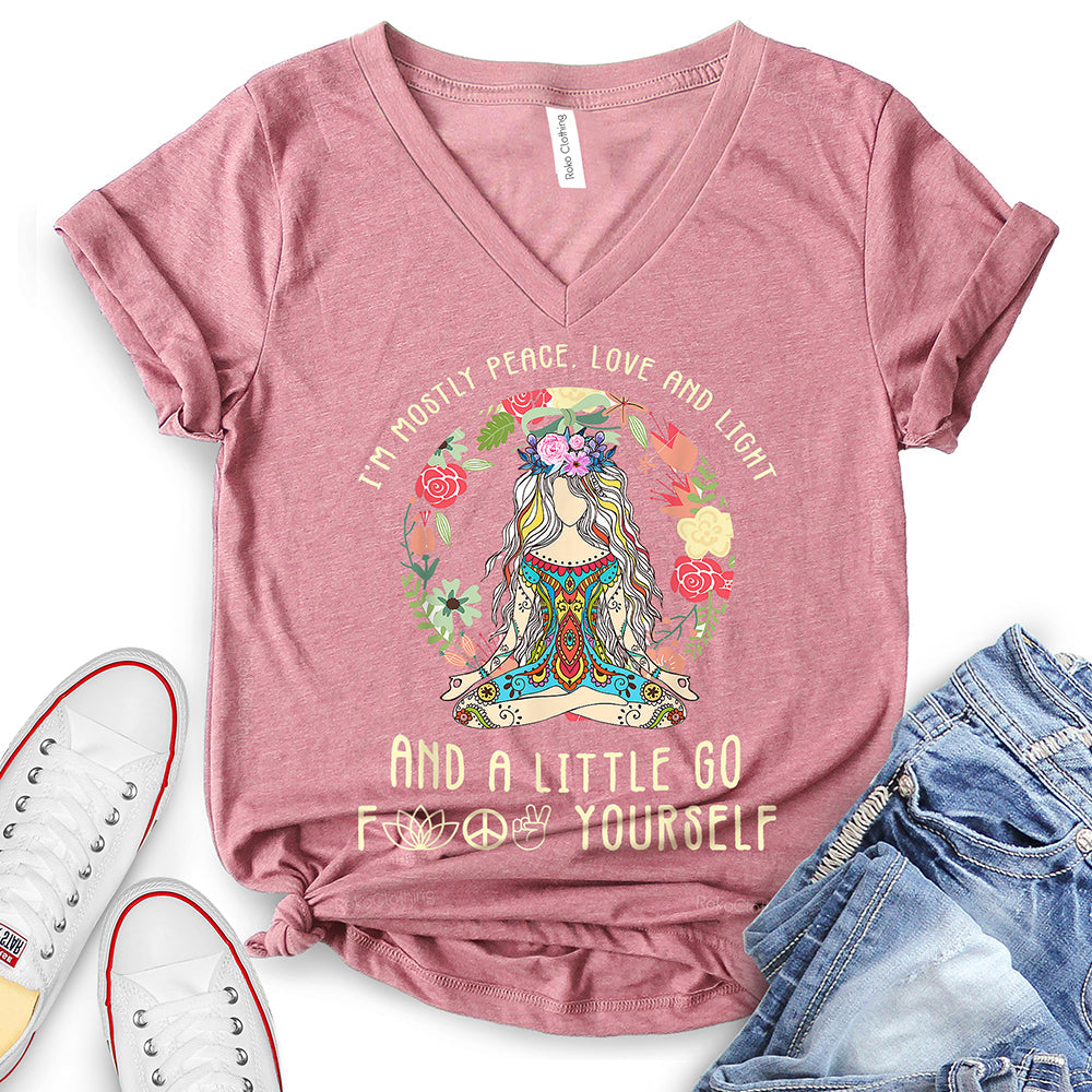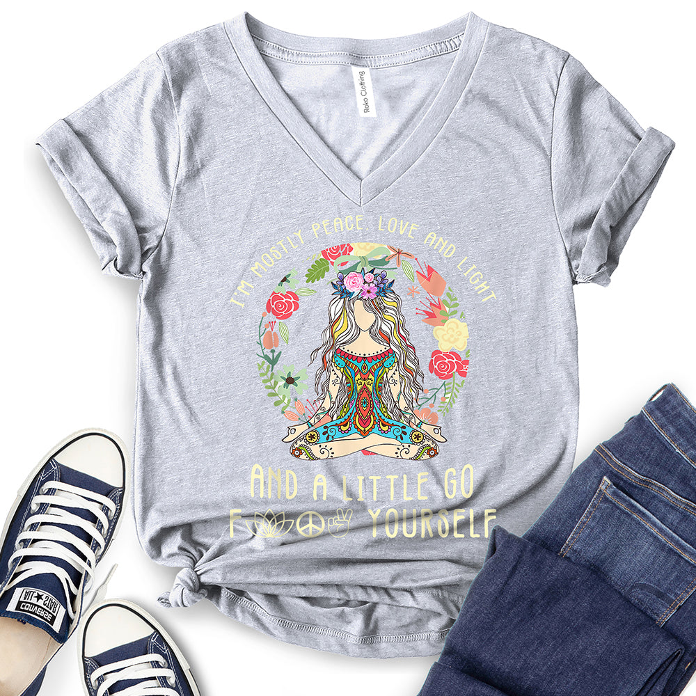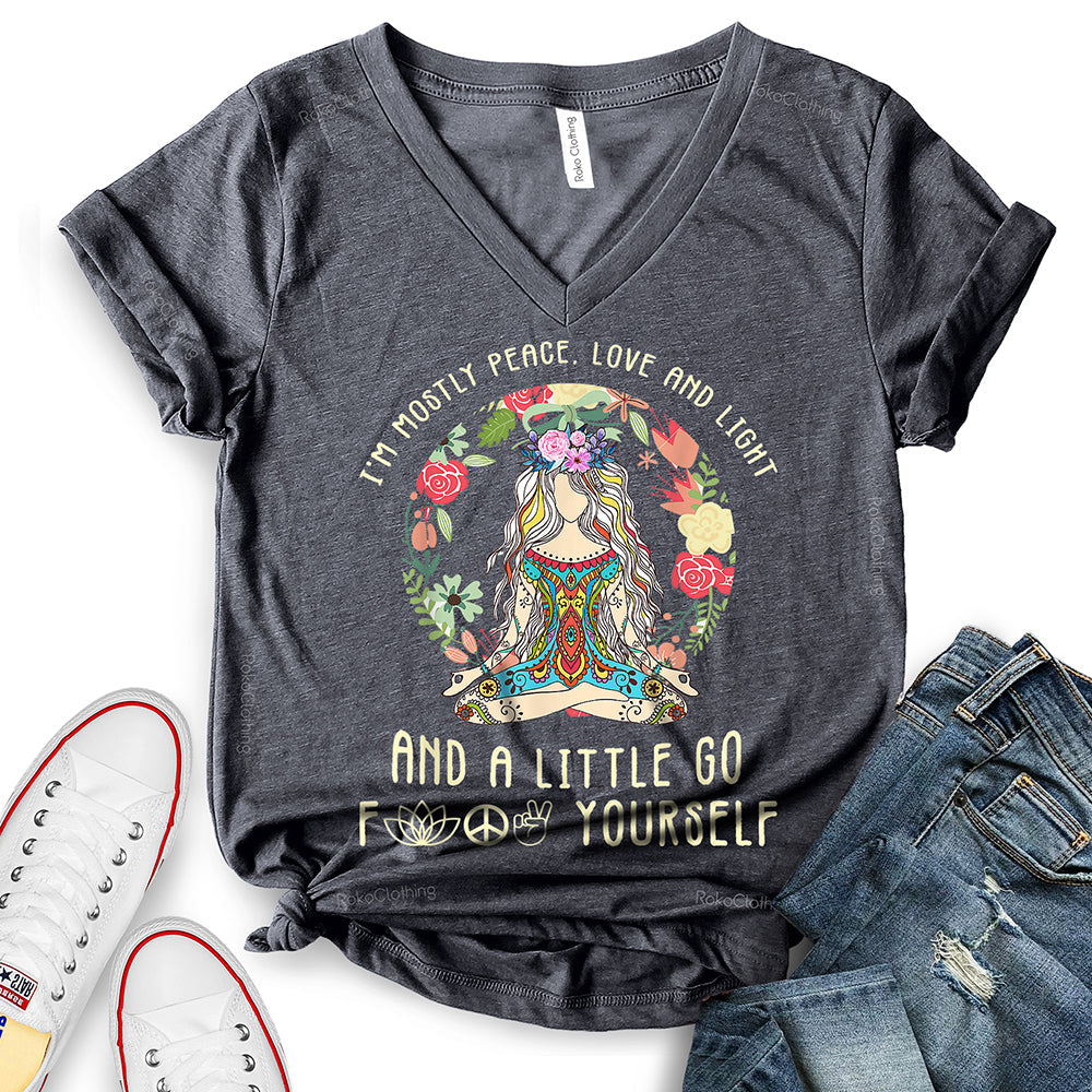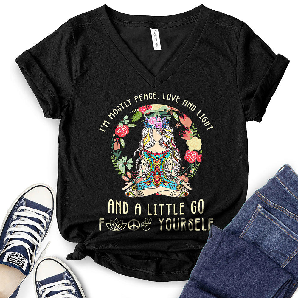 - WIDELY USAGE: I’m Mostly Peace Love and Light T-Shirt is suitable for casual, school, home, street, office, party, camping, hiking, shopping, daily life, etc. You can easily match with shorts, pants, jeans, shoes, boots, etc. Such a beautiful and temperamental T-shirt will make you more fashionable and attractive!