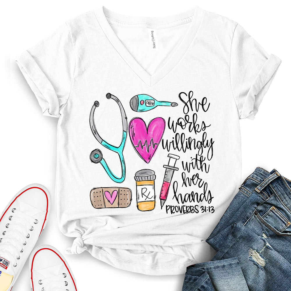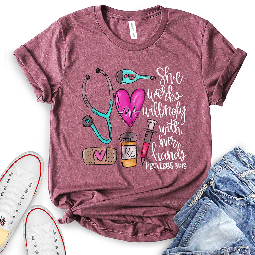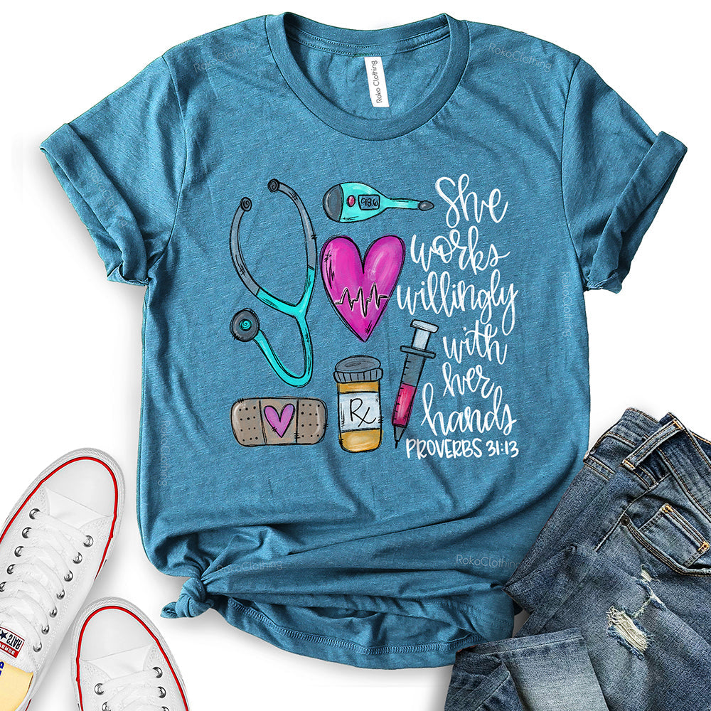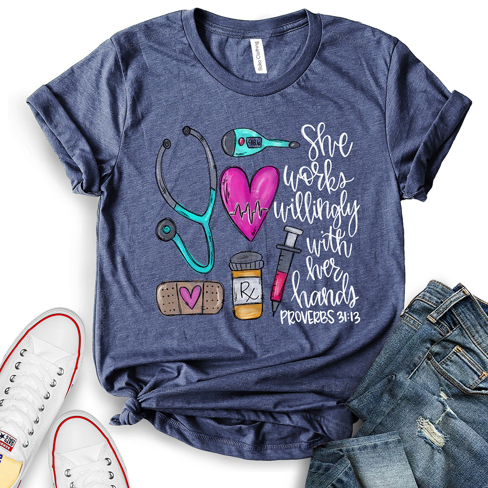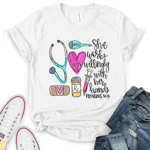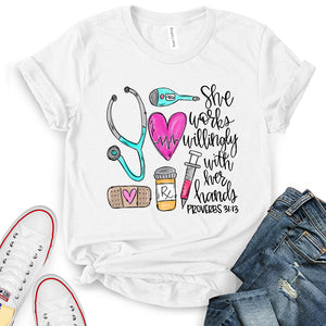 - WIDELY USAGE: She Works Willingly With Her Hands Proverbs 31:13 T-shirt is suitable for casual, school, home, street, office, party, camping, hiking, shopping, daily life, etc. You can easily match with shorts, pants, jeans, shoes, boots, etc. Such a beautiful and temperamental T-shirt will make you more fashionable and attractive!
