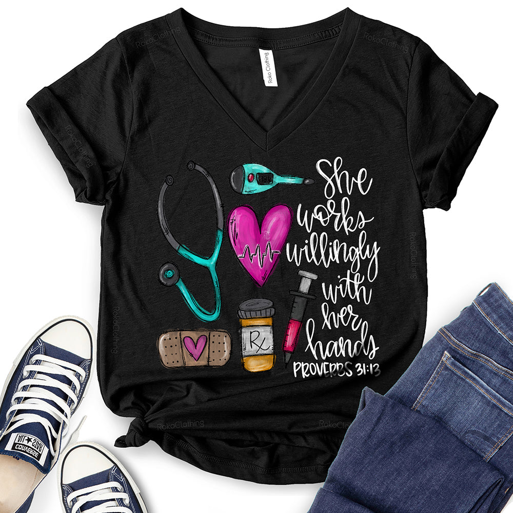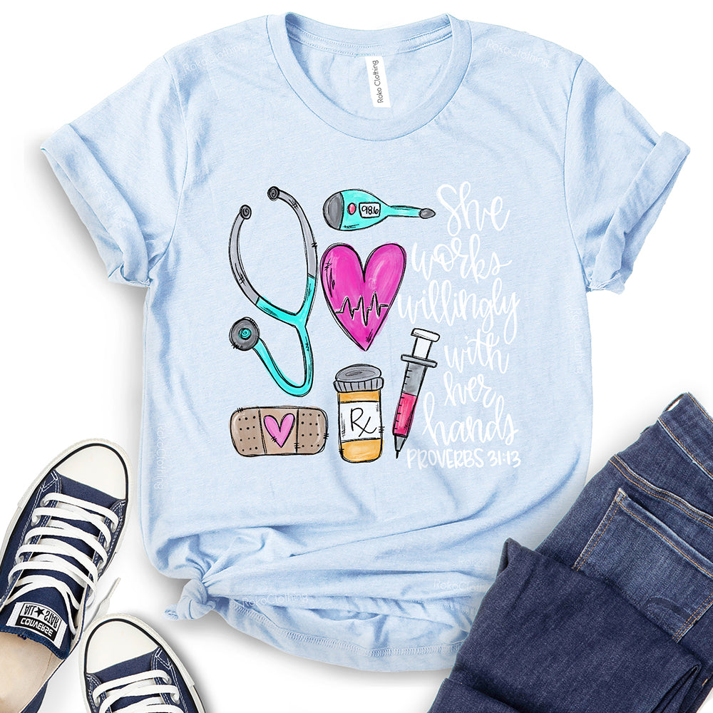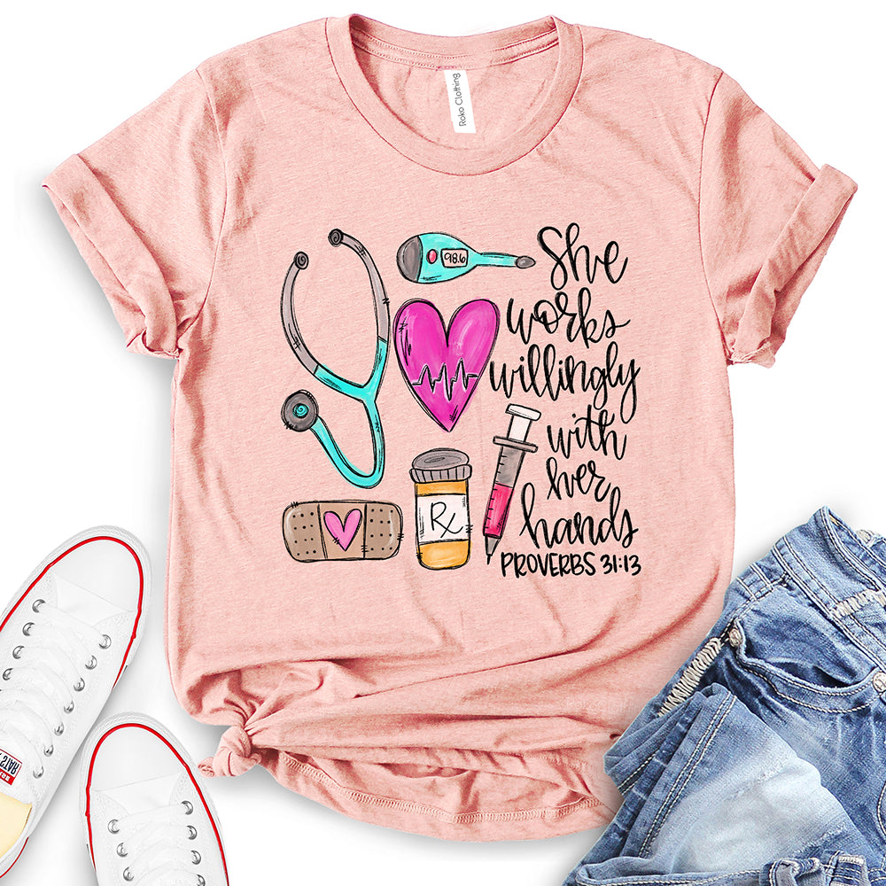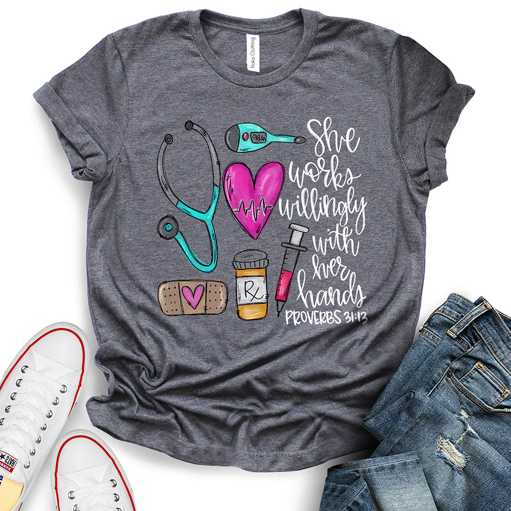 - WIDELY USAGE: She Works Willingly With Her Hands Proverbs 31:13 T-shirt is suitable for casual, school, home, street, office, party, camping, hiking, shopping, daily life, etc. You can easily match with shorts, pants, jeans, shoes, boots, etc. Such a beautiful and temperamental T-shirt will make you more fashionable and attractive!