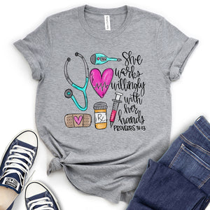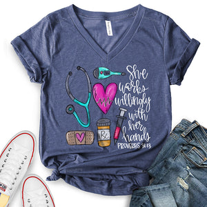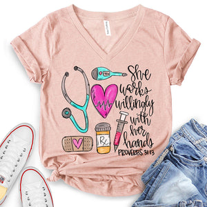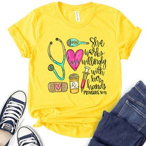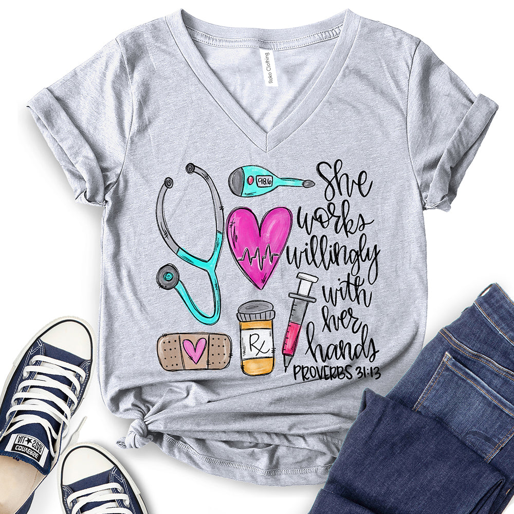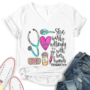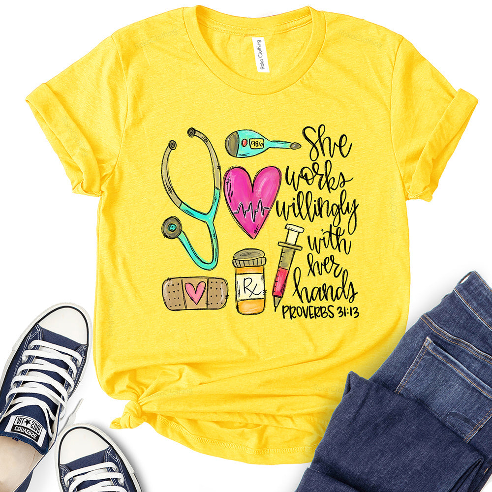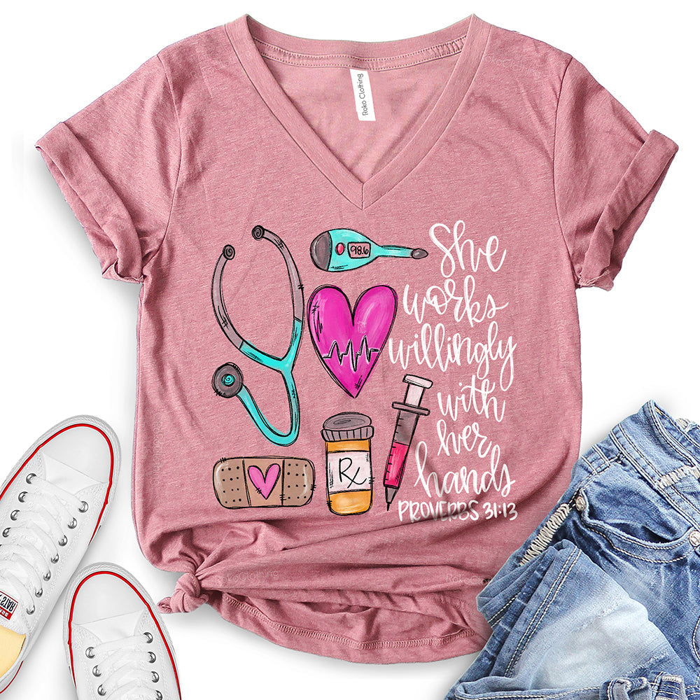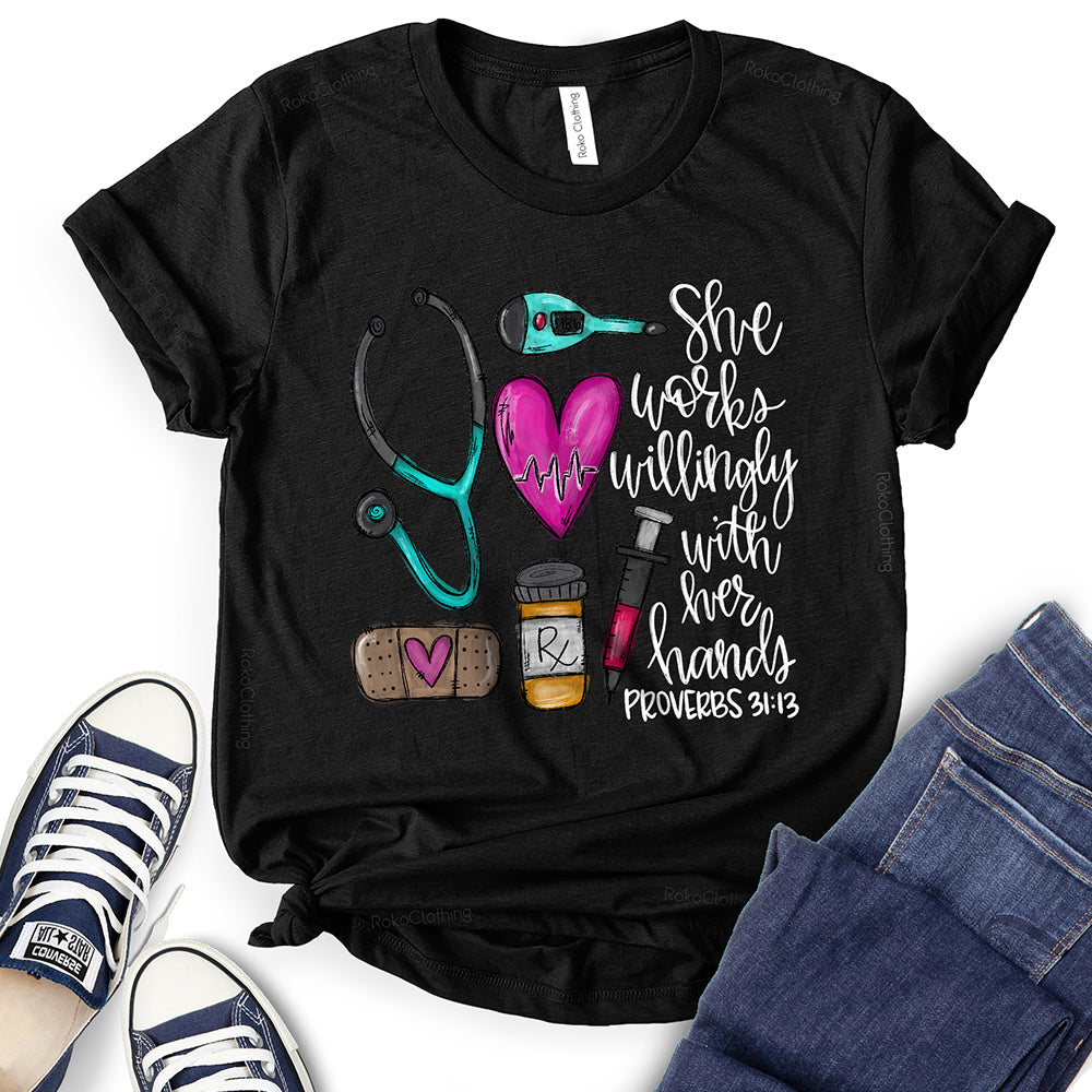 - WIDELY USAGE: She Works Willingly With Her Hands Proverbs 31:13 T-shirt is suitable for casual, school, home, street, office, party, camping, hiking, shopping, daily life, etc. You can easily match with shorts, pants, jeans, shoes, boots, etc. Such a beautiful and temperamental T-shirt will make you more fashionable and attractive!